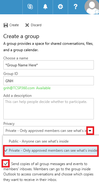 • Or you can select Private to create a group in which membership requires approval by a group owner and only members can view group content. Select box next to “send copies“so subscribers can receive an email and calendar event notifications in both their group inbox and personal inbox.Office 365 Creating A Contact Group Step 8 Part 2